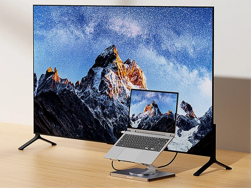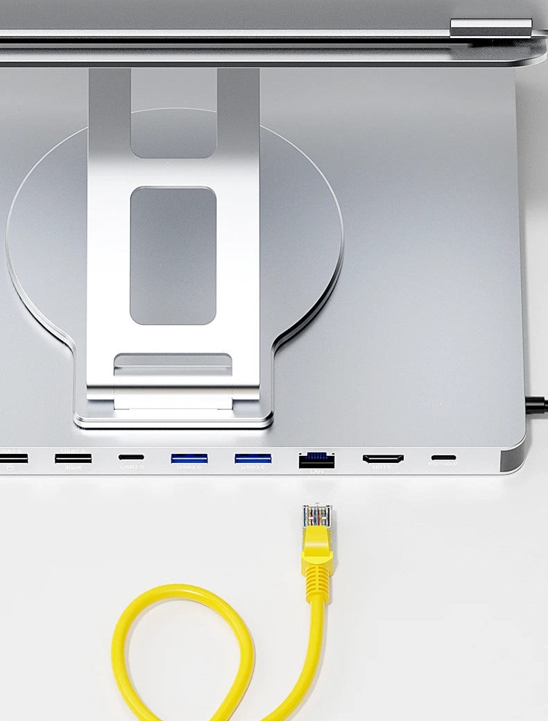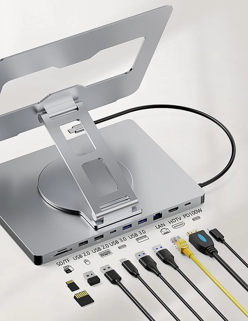 Elevate your workspace with the Her Work Nook Aluminum iPad and Laptop Holder featuring a 10-in-1 docking C hub. This sleek stand not only securely holds your laptop or tablet but also expands connectivity with 4K 60Hz video output, USB 3.0 data transfer at 5Gbps, and a powerful 100W PD charger. In an aluminum case, the rotating adjustable height. Designed for efficiency and style, it transforms your desktop into a streamlined hub, optimizing productivity while keeping your devices charged and connected seamlessly.